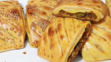 4. تسوية الخبز المحشو باللحم في طاسة مع وضع القليل من الزيت، مع التأكد من تسوية كمية اللحم من الداخل.